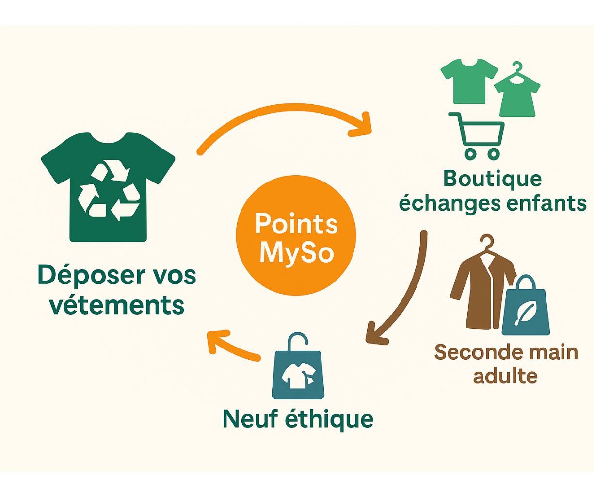 Vos vêtements usés ou abîmés ne finissent pas à la poubelle. Déposez-les chez nous et recevez des crédits MySo à utiliser sur nos 3 plateformes.